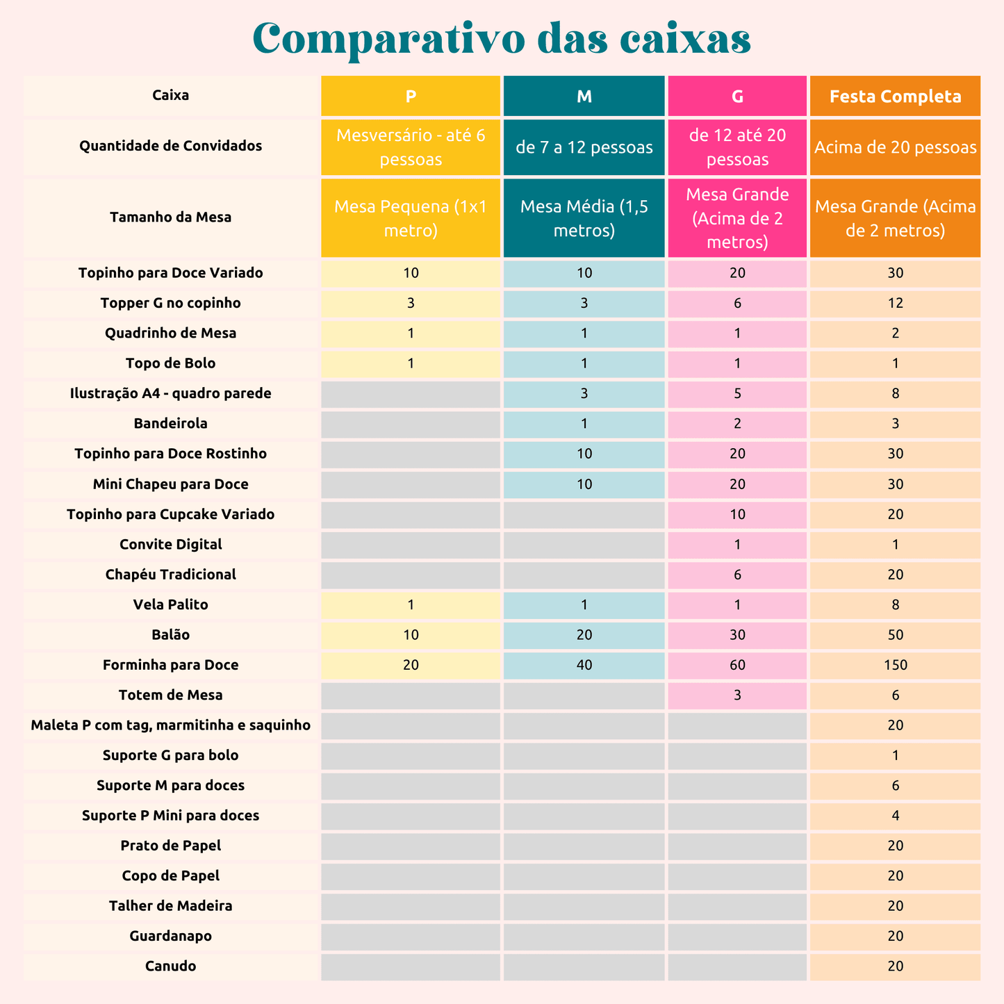 Na caixa P usamos até 2 fotos diferentes nas artes, na caixa M 3 fotos, na caixa G 6 fotos e na festa completa até 8 fotos